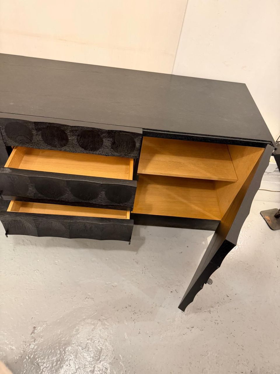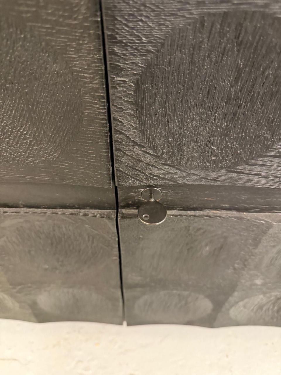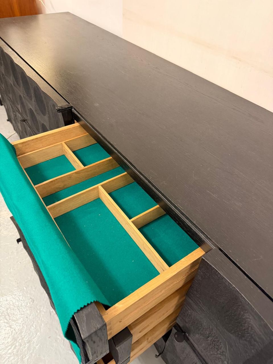 Il s’agit d’un buffet brutaliste en chêne teinté noir, conçu par le designer belge Jean Batenburg pour la société MI. Ce modèle a été conçu en 1969 et produit pendant quelques années seulement.