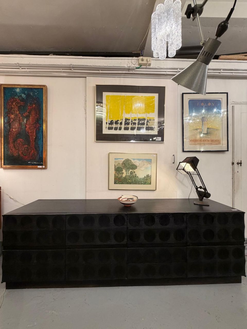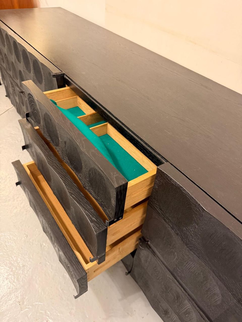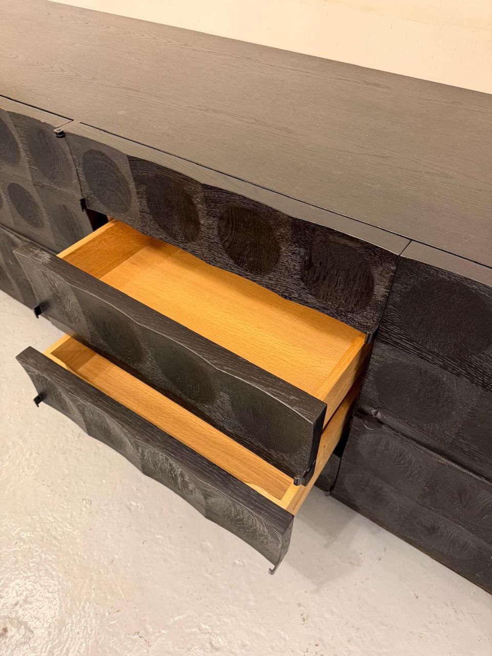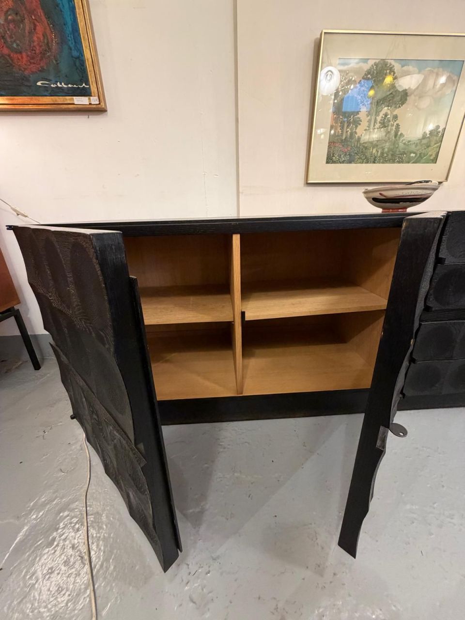 Il s’agit d’un buffet brutaliste en chêne teinté noir, conçu par le designer belge Jean Batenburg pour la société MI. Ce modèle a été conçu en 1969 et produit pendant quelques années seulement.