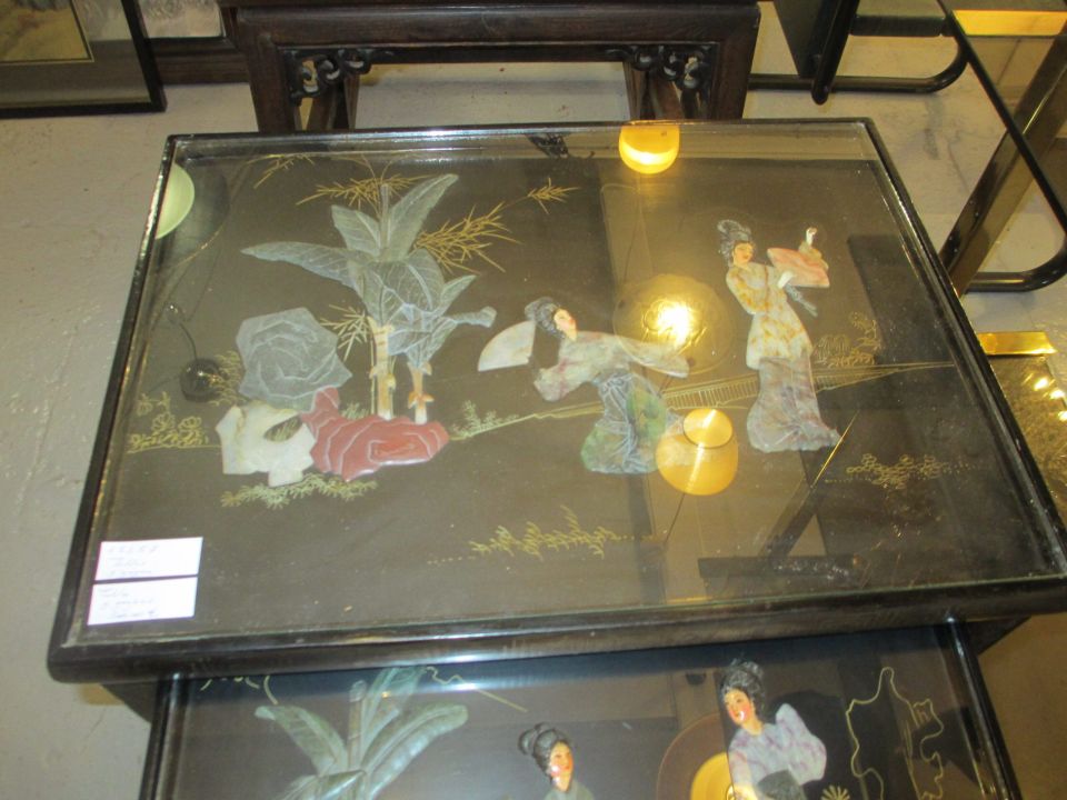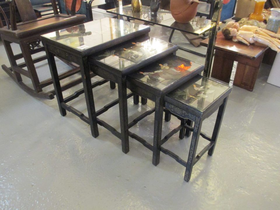 série de 4 tables gigognes chinoises, 4 décors différents sous verre.